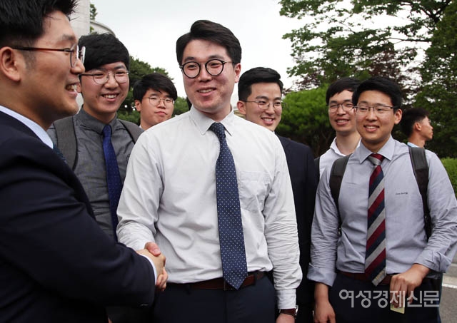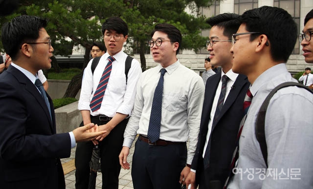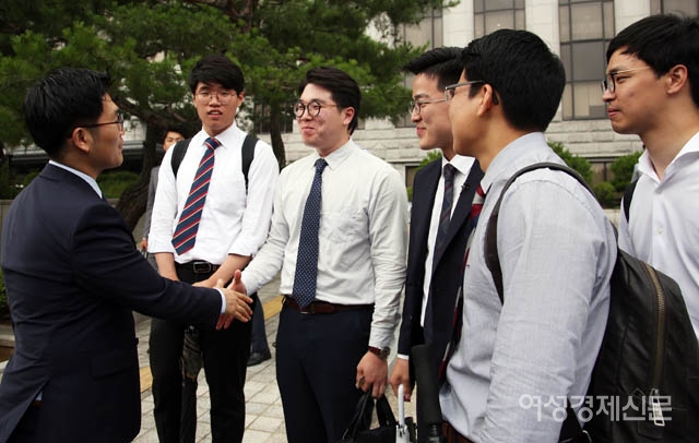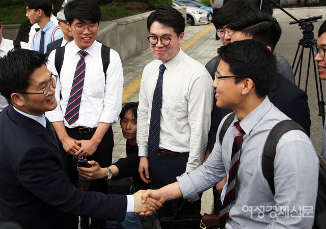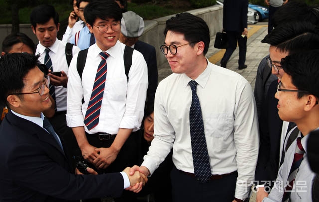 28일 오후 서울 종로구 헌법재판소에서 '양심적 병역거부' 헌법소원과 위헌 소송을 청구했던 양심적 병역 거부자들이 축하의 악수를 하고 있다. 헌재는 양심적 병역거부 처벌에 대해서는 합헌, 대체 복무제가 없는 병역법은 헌법불합치 판결을 내렸다. /양문숙 기자 yms7890@hanmail.net