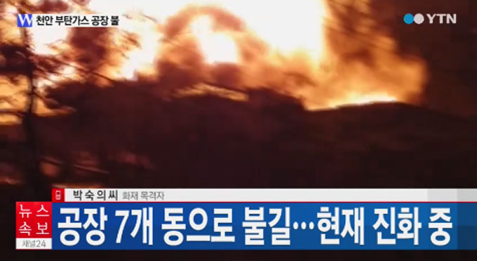 18일 오전 6시40분쯤 충남 천안에 있는 부탄가스 제조공장에서 큰 불이 나 7시45분 현재 공장 2개동이 불타고 있다. 인명피해 여부는 확인되지 않았다. 소방당국은 광역3호를 발령하고 소방차 30대와 소방관 200여명을 동원해 진화작업을 벌이고 있다.