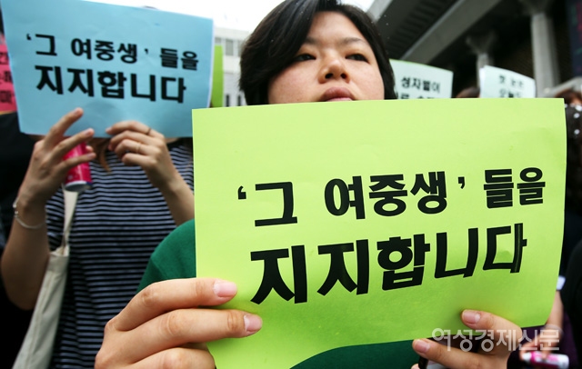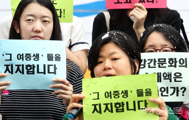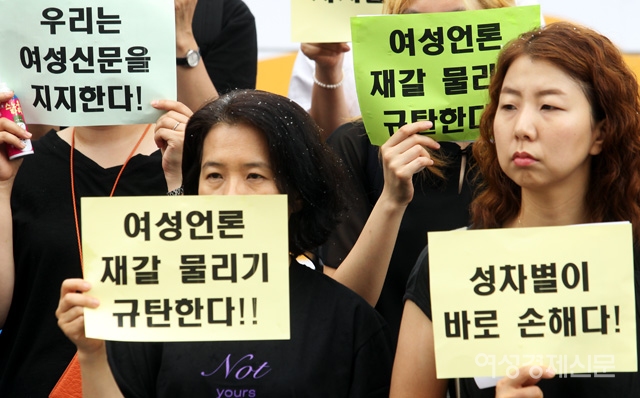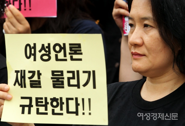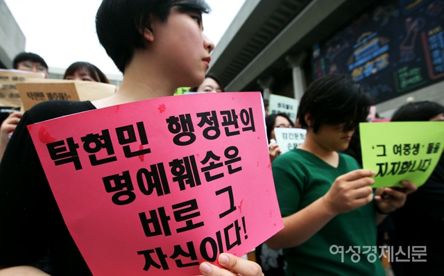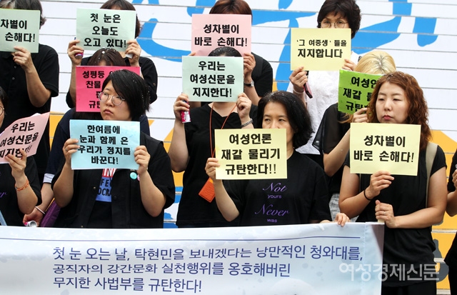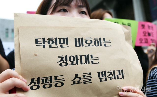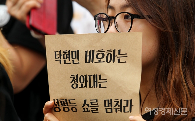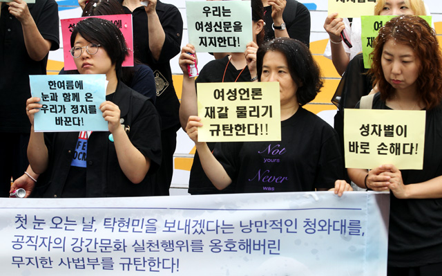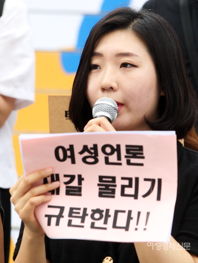 12일 오전 서울 세종문화회관 계단에서 젠더정치연구소 등 활동가들이 탁현민 청와대 행정관에 대한 임종석 비서실장의 발언과 여성신문의 명예훼손 인정한 사법부 판결을 규탄하는 기자회견 중간에 여성신문기자가 발언을 하고 있다. /양문숙 기자 yms7890@hanmail.net