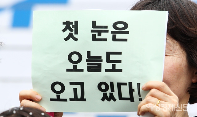 12일 오전 서울 세종문화회관 계단에서 젠더정치연구소 등 활동가들이 탁현민 청와대 행정관에 대한 임종석 비서실장의 발언과 여성신문의 명예훼손 인정한 사법부 판결을 규탄하는 기자회견 열고 있다. 기자회견 참석자들이 "첫눈이 오면 놓아주겠다"며 탁 행정관의 사의를 반려한 청와대를 비판하는 '눈 뿌리기' 퍼포먼스를 벌이고 있다. /양문숙 기자 yms7890@hanmail.net