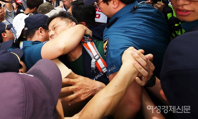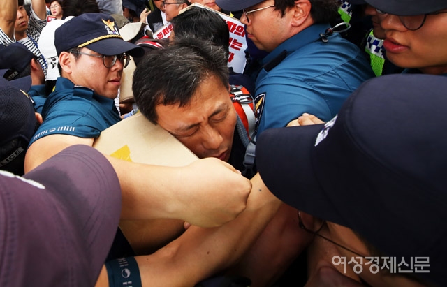 13일 오후 서울 종로구 청와대 사랑채 앞에서 '최저임금 개악법 폐기 임금개악 저지 민주노총 결의대회'를 마친 김명환 민주노총 위원장을 비롯한 참가자들이 '최저임금삭감법 폐기' 서명지 박스를 들고 청와대로 행진하자 경찰이 제지하고 있다. /양문숙 기자 yms7890@hanmail.net