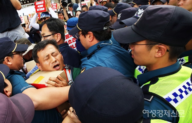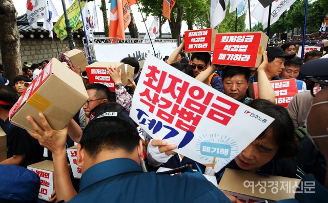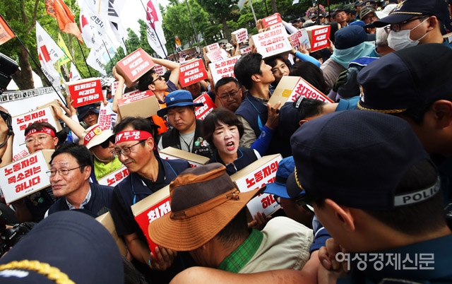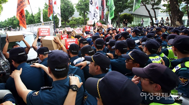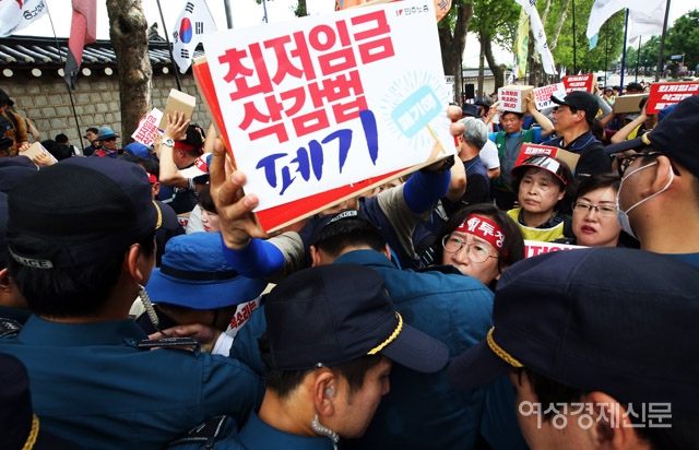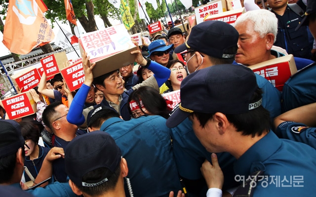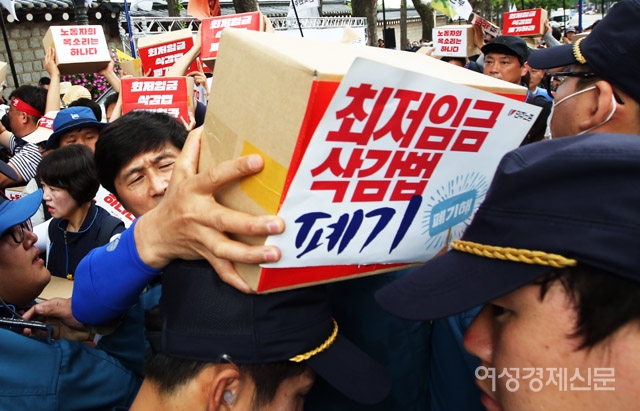 13일 오후 서울 종로구 청와대 사랑채 앞에서 '최저임금 개악법 폐기 임금개악 저지 민주노총 결의대회'를 마친 김명환(앞줄 왼쪽 두 번째) 민주노총 위원장을 비롯한 참가자들이 '최저임금삭감법 폐기' 서명지 박스를 들고 청와대로 행진하자 경찰이 제지하고 있다. /양문숙 기자 yms7890@hanmail.net