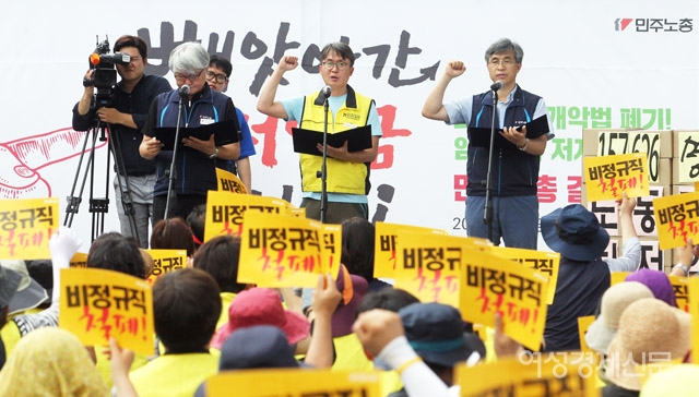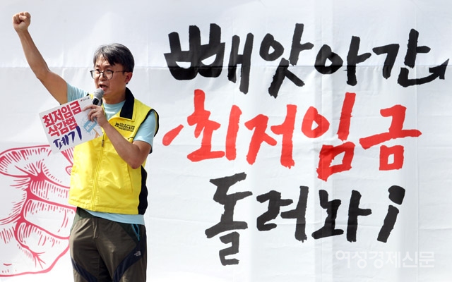 13일 오후 서울 종로구 청와대 사랑채 앞에서 열린 최저임금개악 폐기, 임금개악 저지 민주노총 결의대회에서 민주노총 일반노조 김종욱 분회장이 '최저임금삭감법 폐기'를 촉구하며 투쟁발언을 하고 있다. /양문숙 기자 yms7890@hanmail.net13일 오후 서울 종로구 청와대 사랑채 앞에서 열린 최저임금개악 폐기, 임금개악 저지 민주노총 결의대회에서 민주노총 최저임금위원회 노동자위원들이 '최저임금위원회 복귀불가 입장문 발표'를 하고 있다. /양문숙 기자 yms7890@hanmail.net SCRAP SHARE 관련기사 '최저임금 개악법 폐기' 민주노총 결의대회 양문숙 기자 yms7890@hanmail.net 다른기사 보기 저작권자 © 여성경제신문 무단전재 및 재배포 금지 당신만 안 본 뉴스 건보공단, 배상책임보험 트집 잡다 '역풍'···환수금 대신 망신살 챙겼다 56조 화이자 '승자의 저주'···ADC 2년 '옥석', 리가켐바이오 '순항' 박헌정 더봄 올가을 단풍은 대체 언제 드는 거야? 홍미옥 더봄 요즘 핫해!···달콤함의 최강자 무화과의 매력 김성재 칼럼 마이클 버리의 'AI 거품설' 타당한가 기자수첩 론스타 사건, '시작은 DJ, 끝은 한동훈'이란 유치한 서사 '기대감' 끝났다···3분기 제약·바이오社 성과 '피라미드' 건보공단, 배상책임보험 트집 잡다 '역풍'···환수금 대신 망신살 챙겼다 개의 댓글 회원로그인 작성자 비밀번호 댓글 내용입력 댓글 정렬 BEST댓글 BEST 댓글 답글과 추천수를 합산하여 자동으로 노출됩니다. 닫기 더보기 댓글삭제 삭제한 댓글은 다시 복구할 수 없습니다. 그래도 삭제하시겠습니까? 비밀번호 닫기 댓글수정 댓글 수정은 작성 후 1분내에만 가능합니다. 본문 / 400 비밀번호 닫기 내 댓글 모음 닫기 주요기사 최초 '유엔 여성 사무총장' 나오나···차기 후보 권장 명시 GC녹십자, 'mRNA-LNP 플랫폼' 성과 발표···"혁신 치료제 개발 지속" KB금융, 데이터·AI 전략 총점검···양종희 "체감할 수 있는 혁신해야" 비만약 ‘위고비’도 못 넘은 벽···알츠하이머 임상 줄줄이 ‘좌절’ "누가 발행?" 답 없고 "준비금은?" 말 없는 하나금융 스테이블코인 전략 "죽고 다치는 급식노동자 많아"···국회 앞 '법 개선 촉구' 집회