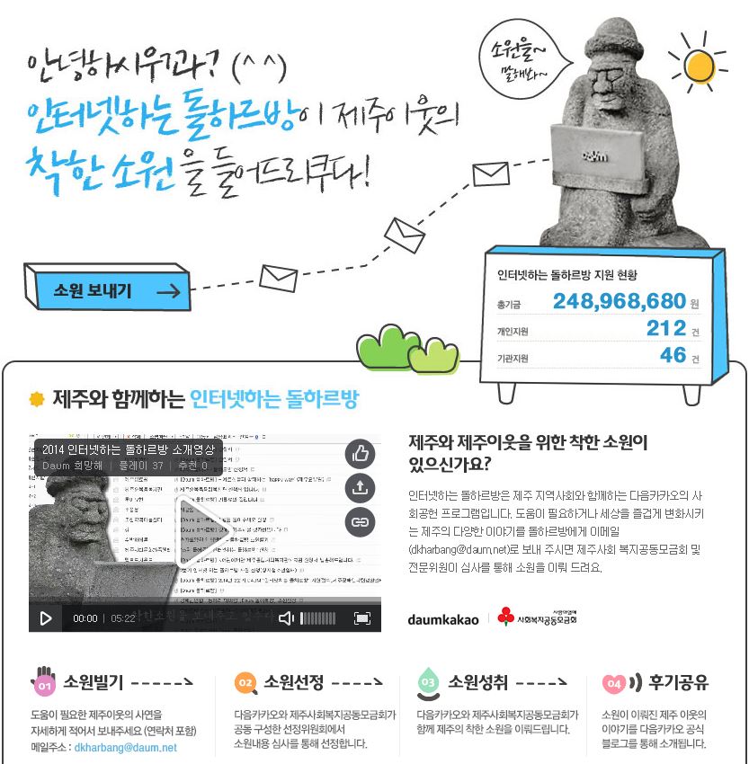 2008년에 시작한 '인터넷하는돌하르방'은 도움이 필요한 제주 이웃의 사연을 인터넷에 올리면 착한 소원을 들어주는 지역공헌사업이다. 다음카카오는 현재까지 개인 212건, 단체 46건 등 총 258건의 소원을 후원해오고 있다.