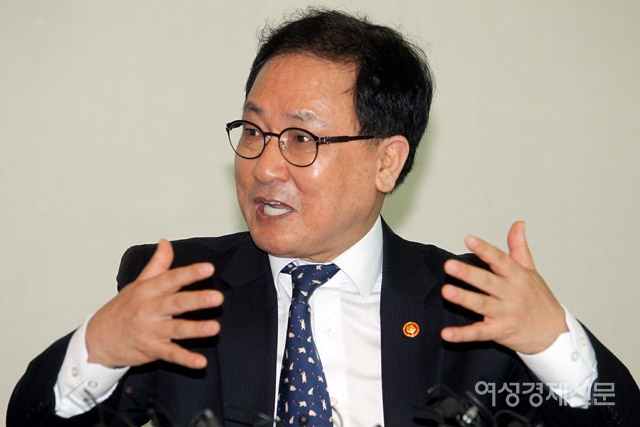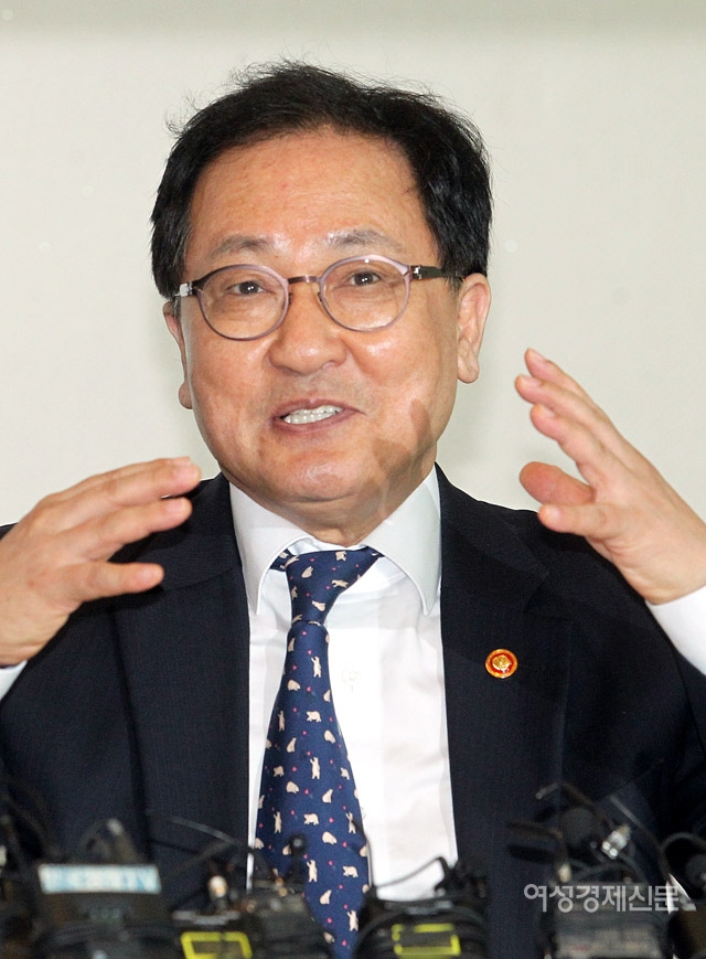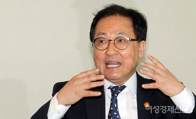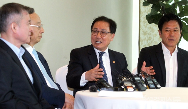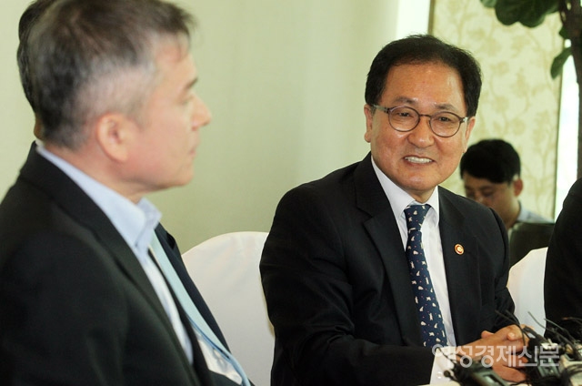 유영민 과학기술정보통신부 장관가 17일 오전 서울 영등포구 여의도 매리어트 파크센터에서 열린 과기정통부 장관-통신 3사 최고경영자(CEO) 간담회에서 각 통신사 대표들과 대화하고 있다.. /양문숙 기자 yms7890@hanmail.net