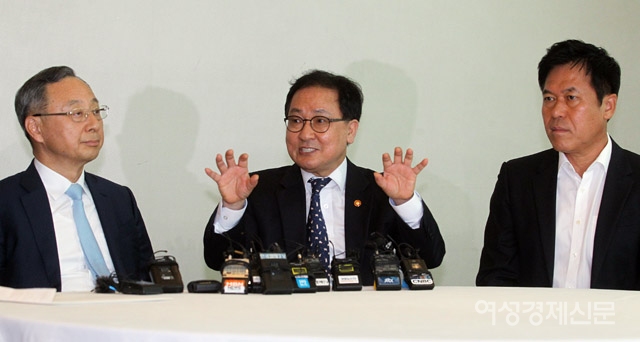 유영민 과학기술정보통신부 장관가 17일 오전 서울 영등포구 여의도 매리어트 파크센터에서 열린 과기정통부 장관-통신 3사 최고경영자(CEO) 간담회에서 각 통신사 대표들과 대화하고 있다. 된쪽부터 황창규 KT 회장, 유 장관, 박정호 SK텔레콤 사장. /양문숙 기자 yms7890@hanmail.net
