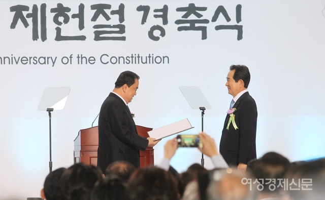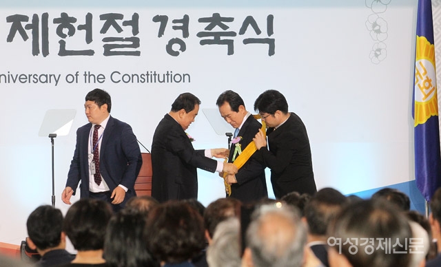 17일 오전 국회 로텐더홀에서 열린 제70주년 제헌절 경축식에서 문희상 국회의장이 정세균 전 의장에게 문재인 대통령 명의의 국민 훈장을 전달하고 있다. /양문숙 기자 yms7890@hanmail.net17일 오전 국회 로텐더홀에서 열린 제70주년 제헌절 경축식에서 문희상 국회의장이 정세균 전 의장에게 문재인 대통령 명의의 국민 훈장을 전달하고 있다. /양문숙 기자 yms7890@hanmail.net정세균 전 국회의장이 17일 오전 서울 여의도 국회 본청 로텐더홀에서 열린 제70주년 제헌절 경축식에 참석하고 있다. /양문숙 기자 yms7890@hanmail.net