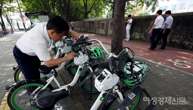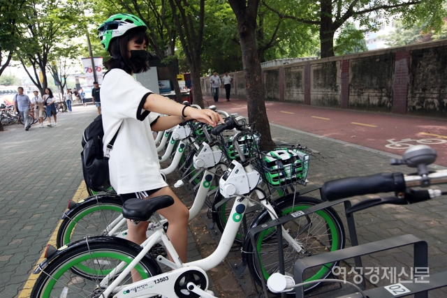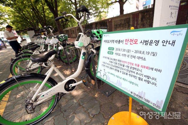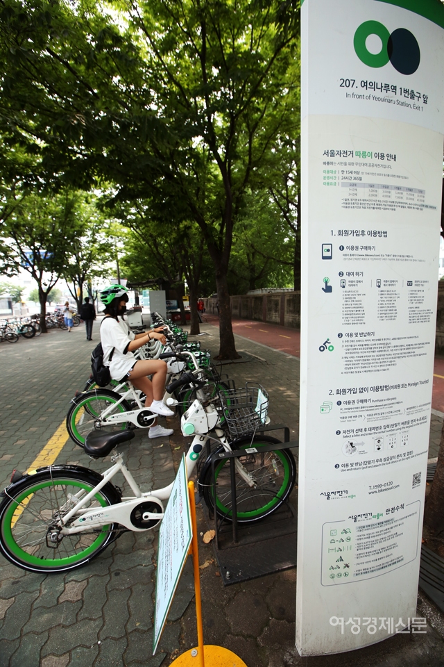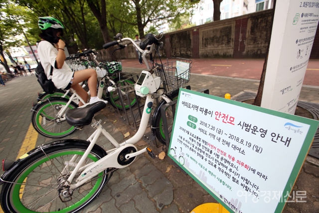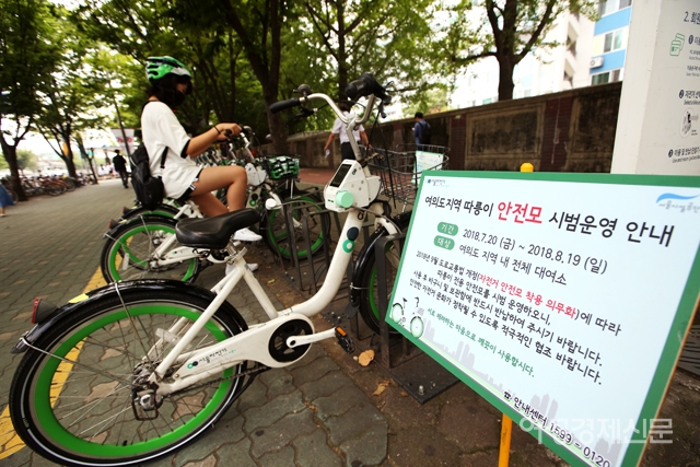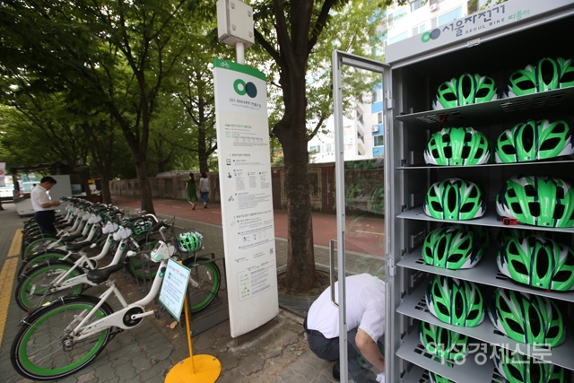 한 시민이 20일 서울 여의나루역에 설치된 '따릉이' 대여소에서 안전모와 저전거를 빌리고 있다. 서울시설공단은 오는 9월 자전거 헬멧 착용 의무화를 앞두고 이날부터 여의도 지역 따릉이 대여소 30곳에서 안전모 500개를 시범 대여해 준다. /양문숙 기자 yms7890@hanmail.net