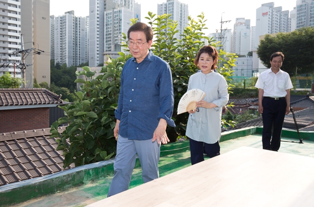 박원순 서울시장이 22일 오후 강북구 삼양동의 2층 옥탑방에서 '강북 한 달 살이'를 시작하며 강난희 여사와 함께 옥탑 평상을 둘러 보고 있다. 박 시장은 조립식 건축물 2층 옥탑방(방 2개, 9평(30.24㎡))에서 내달 18일까지 기거하면서 지역 문제의 해법을 찾고 강남·북 균형발전 방안을 모색할 예정이다. /사진공동취재단