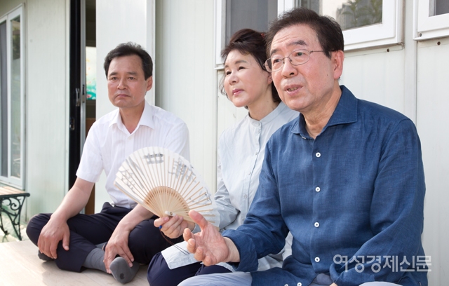 박원순 서울시장이 22일 오후 강북구 삼양동의 2층 옥탑방에서 '강북 한 달 살이'를 시작하며 강난희 여사와 박겸수 강북구청장과 함께 이야기를 나누고 있다. 박 시장은 조립식 건축물 2층 옥탑방(방 2개, 9평(30.24㎡))에서 내달 18일까지 기거하면서 지역 문제의 해법을 찾고 강남·북 균형발전 방안을 모색할 예정이다. /사진공동취재단
