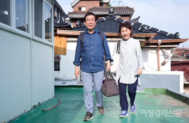 박원순 서울시장이 22일 오후 강북구 삼양동의 2층 옥탑방에서 '강북 한 달 살이'를 시작하기 위해 부인 강난희 여사와 들어서고 있다. 박 시장은 조립식 건축물 2층 옥탑방(방 2개, 9평(30.24㎡))에서 내달 18일까지 기거하면서 지역 문제의 해법을 찾고 강남·북 균형발전 방안을 모색할 예정이다. /사진공동취재단