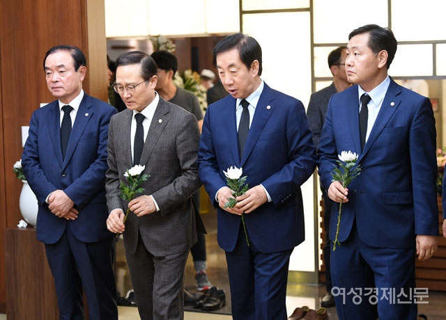 23일 오후 고 노회찬 의원의 빈소가 차려진 서울 서대문구 신촌세브란스병원 장례식장에서 여야 원내대표들이 조문을 하고 있다. 오른쪽부터 김관영 바른미래당 원내대표, 김성태 자유한국당 원내대표, 홍영표 더불어민주당 원내대표, 장병완 민주평화당 원내대표. /사진공동취재단