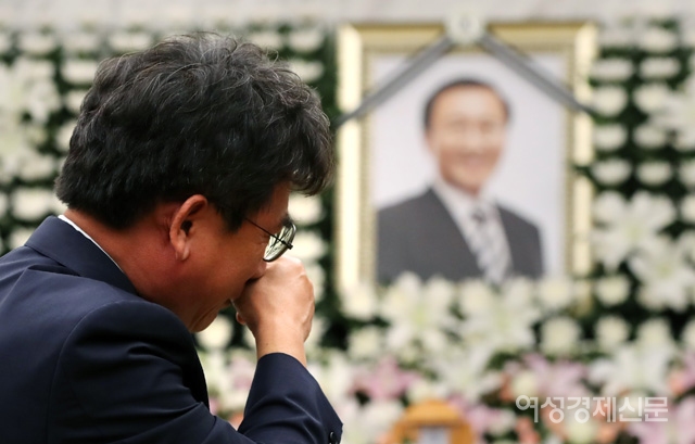 유시민 작가가 23일 오후 서울 서대문구 신촌 세브란스 병원 장례식장에 마련된 고 노회찬 정의당 원내대표의 빈소를 찾아 눈물을 흘리고 있다. /양문숙 기자 yms7890@hanmail.net