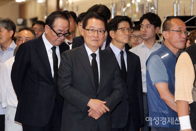 서청원 무소속 의원과 박지원 민주평화당 의원, 김문수 전 경기지사(왼쪽부터)가 24일 오후 서울 서대문구 연세대 세브란스병원 장례식장에 마련된 고 노회찬 정의당 원내대표의 빈소를 조문 하기 위해 줄을 서 있다. /양문숙 기자 yms7890@hanmail.net