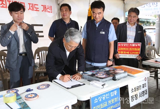 김동철 바른미래당 비상대책위원장이 10일 김관영 원내대표 등과 서울 광화문 세종로 '최저임금 제도개선 촉구 소상공인 농성장'을 방문해 서명운동에 동참하고 있다. /양문숙 기자 yms7890@hanmail.net