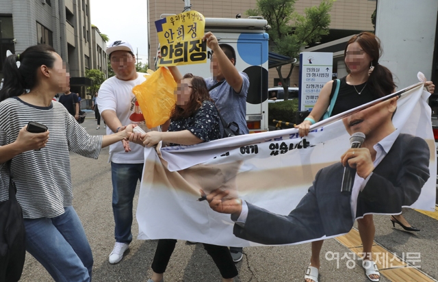 비서에 대한 성폭력 혐의로 기소된 안희정 전 충남지사가 1심에서 무죄를 선고받은 14일 오전 서울서부지법 앞에서 한 여성이 안 전 지사를 지지하는 사람의 현수막을 뺏으려 하고 있다. /양문숙 기자 yms7890@hanmail.net