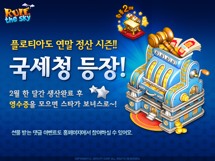 뿐만 아니라, 연말 정산과 관련된 퀴즈를 맞춘 유저를 대상으로 추첨을 통해 국세청 건물과 은열쇠 10개, 50 이벤트 스타를 선물로 증정하며 보따리 왕창, 돛단배 꽉꽉, 비공정 빵빵 스타 상품을 첫 구매하는 유저에게 최대 '500스타'를 추가 획득할 수 있는 별항아리를 제공한다.