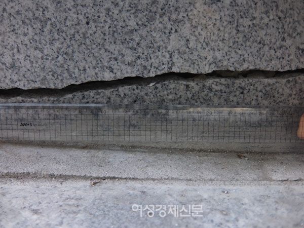 이번에 새롭게 발견된 8003번 환기구 균열은 생각보다 심각하다. 균열 길이는 1m내외지만 깊이가 12cm에 이른다. 균열된 벽면 틈으로 여성경제신문이 직접 투명 30cm 자를 넣자 무려 12cm 깊이를 보인 것이다.