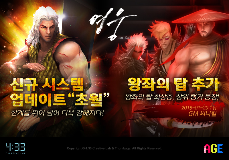 네시삼십삼분(대표 양귀성, 소태환, 이하 4:33)은 썸에이지(대표 백승훈)에서 개발한 모바일게임 '영웅 for Kakao'에 초월, 랜덤 진화 등 새로운 시스템이 업데이트됐다고 29일 밝혔다.