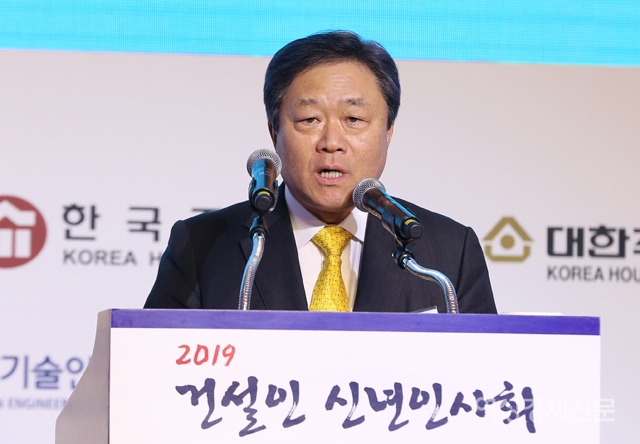 유주현 건설단체연합회장이 4일 서울 중구 롯데호텔에서 열린 '2019년 건설인 신년인사회'에서 신년사를 하고있다. /문인영 기자 photoiym@gmail.com유주현 건설단체연합회장이 4일 서울 중구 롯데호텔에서 열린 '2019년 건설인 신년인사회'에서 신년사를 하고있다. /문인영 기자 photoiym@gmail.com
