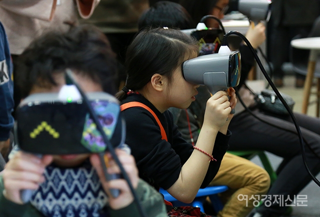 17일 서울 강남구 코엑스에서 열린 '제16회 대한민국 교육박람회'에서 어린이들이 키즈 VR체험을 하고 있다. AI, 코딩, 로봇, VR 등 에듀테크가 결합된 교육 프로그램, 기자재, 교구 등 미래 교육산업을 만날 수 있는 이번 박람회는 18일까지 개최된다. /문인영 기자 photoiym@gmail.com