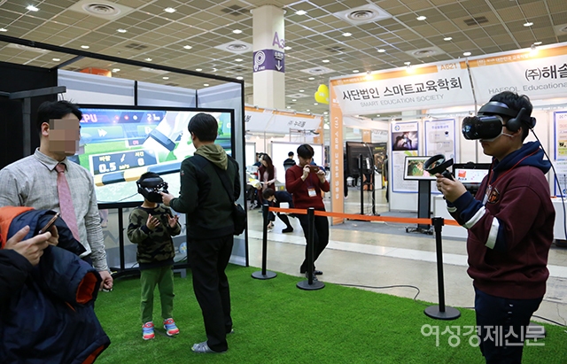 17일 서울 강남구 코엑스에서 열린 '제16회 대한민국 교육박람회'에서 관람객들이 스포츠 VR체험을 하고 있다. AI, 코딩, 로봇, VR 등 에듀테크가 결합된 교육 프로그램, 기자재, 교구 등 미래 교육산업을 만날 수 있는 이번 박람회는 18일까지 개최된다. /문인영 기자 photoiym@gmail.com