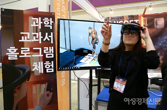17일 서울 강남구 코엑스에서 열린 '제16회 대한민국 교육박람회'에서 관람객이 교과서 홀로그램 VR체험을 하고 있다. AI, 코딩, 로봇, VR 등 에듀테크가 결합된 교육 프로그램, 기자재, 교구 등 미래 교육산업을 만날 수 있는 이번 박람회는 18일까지 개최된다. /문인영 기자 photoiym@gmail.com
