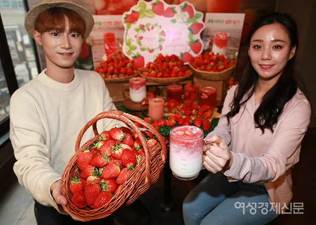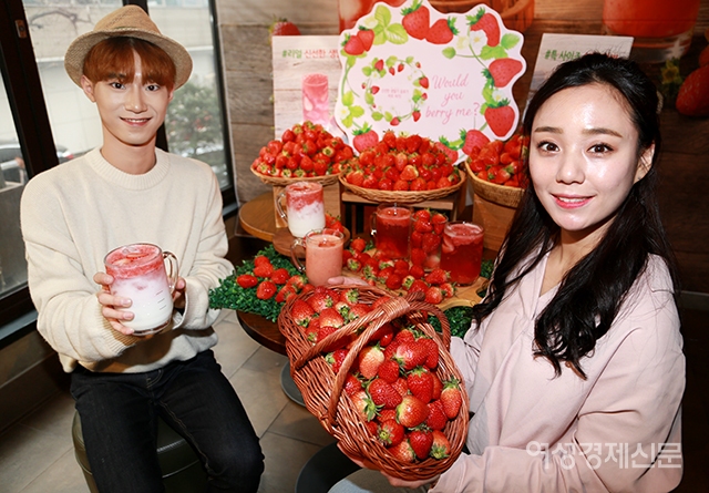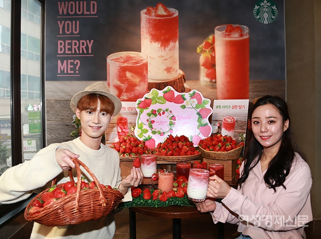 4일 서울 중구 스타벅스 한국프레스센터점에서 모델들이 생딸기를 활용한 음료를 선보이고 있다. 스타벅스에서 5일부터 약 2주 동안 선보이는 딸기 음료 3종 '봄 딸기 라떼', '딸기 유스베리 티', '딸기 파인 주스'는 농가에서 직접 납품 받은 국내 품종의 설향 딸기를 사용한 것이 특징이다. / 문인영 기자 photoiym@gmail.com