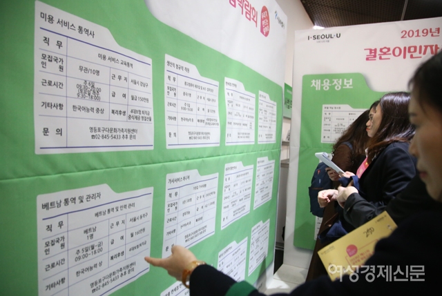 5일 서울 중구 서울시청 시민청에서 열린 '2019년 제11회 결혼이민자 취업박람회'가 구직자들로 북적이고 있다. / 문인영 기자 photoiym@gmail.com5일 서울 중구 서울시청 시민청에서 열린 '2019년 제11회 결혼이민자 취업박람회'에서 구직자들이 상담을 받고 있다. / 문인영 기자 photoiym@gmail.com5일 서울 중구 서울시청 시민청에서 열린 '2019년 제11회 결혼이민자 취업박람회'에서 구직자들이 상담을 받고 있다. / 문인영 기자 photoiym@gmail.com5일 서울 중구 서울시청 시민청에서 열린 '2019년 제11회 결혼이민자 취업박람회'에서 구직자들이 상담을 받고 있다. / 문인영 기자 photoiym@gmail.com5일 서울 중구 서울시청 시민청에서 열린 '2019년 제11회 결혼이민자 취업박람회'에서 구직자들이 채용공고를 보고 있다. / 문인영 기자 photoiym@gmail.com5일 서울 중구 서울시청 시민청에서 열린 '2019년 제11회 결혼이민자 취업박람회'에서 구직자들이 채용공고를 보고 있다. / 문인영 기자 photoiym@gmail.com5일 서울 중구 서울시청 시민청에서 열린 '2019년 제11회 결혼이민자 취업박람회'에서 구직자가 기념사진을 찍고 있다. / 문인영 기자 photoiym@gmail.com5일 서울 중구 서울시청 시민청에서 열린 '2019년 제11회 결혼이민자 취업박람회'가 구직자들로 북적이고 있다. / 문인영 기자 photoiym@gmail.com SCRAP SHARE 문인영 기자 photoiym@gmail.com 다른기사 보기 저작권자 © 여성경제신문 무단전재 및 재배포 금지 당신만 안 본 뉴스 건보공단, 배상책임보험 트집 잡다 '역풍'···환수금 대신 망신살 챙겼다 56조 화이자 '승자의 저주'···ADC 2년 '옥석', 리가켐바이오 '순항' 박헌정 더봄 올가을 단풍은 대체 언제 드는 거야? 홍미옥 더봄 요즘 핫해!···달콤함의 최강자 무화과의 매력 김성재 칼럼 마이클 버리의 'AI 거품설' 타당한가 기자수첩 론스타 사건, '시작은 DJ, 끝은 한동훈'이란 유치한 서사 '기대감' 끝났다···3분기 제약·바이오社 성과 '피라미드' 건보공단, 배상책임보험 트집 잡다 '역풍'···환수금 대신 망신살 챙겼다 개의 댓글 회원로그인 작성자 비밀번호 댓글 내용입력 댓글 정렬 BEST댓글 BEST 댓글 답글과 추천수를 합산하여 자동으로 노출됩니다. 닫기 더보기 댓글삭제 삭제한 댓글은 다시 복구할 수 없습니다. 그래도 삭제하시겠습니까? 비밀번호 닫기 댓글수정 댓글 수정은 작성 후 1분내에만 가능합니다. 본문 / 400 비밀번호 닫기 내 댓글 모음 닫기 주요기사 최초 '유엔 여성 사무총장' 나오나···차기 후보 권장 명시 GC녹십자, 'mRNA-LNP 플랫폼' 성과 발표···"혁신 치료제 개발 지속" KB금융, 데이터·AI 전략 총점검···양종희 "체감할 수 있는 혁신해야" 비만약 ‘위고비’도 못 넘은 벽···알츠하이머 임상 줄줄이 ‘좌절’ "누가 발행?" 답 없고 "준비금은?" 말 없는 하나금융 스테이블코인 전략 "죽고 다치는 급식노동자 많아"···국회 앞 '법 개선 촉구' 집회