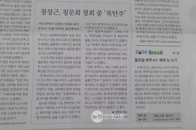 경향신문은, 정성근 후보자는 자신의 위증문제로 청문회가 중단 됐음에도 폭탄주까지 돌리며 식사를 한 사실이 드러나 부적격 논란은 더욱 확산될 것으로 보인다고 밝혔다.