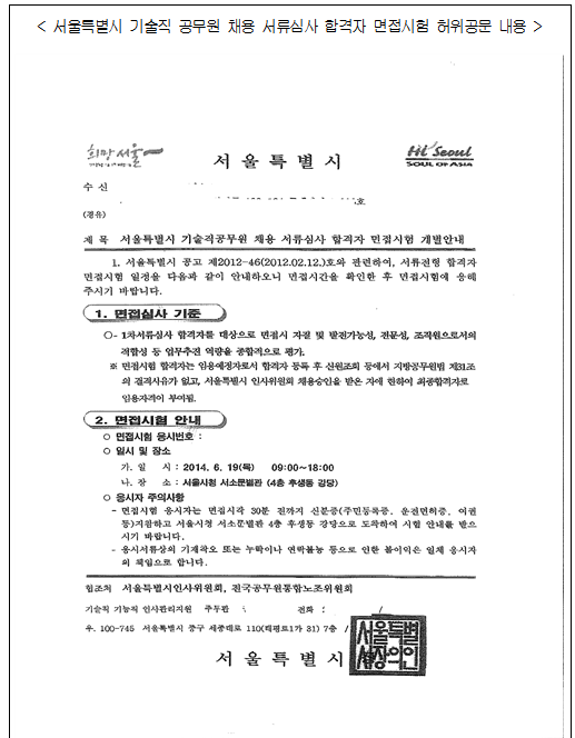 허위 공문서에는 서울시청 서소문별관(4층 후생동 강당)에서 면접시험을 실시한다고 돼 있다.