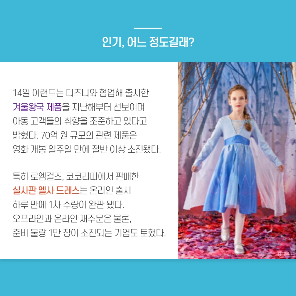 이랜드는 지난해부터 디즈니와 협업한 겨울왕국 제품을 선보이고 있습니다. 70억 원 규모의 관련 제품은 영화 개봉 일주일 만에 절반 이상 소진됐는데요.
