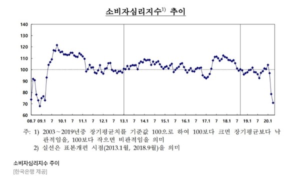 신종 코로나바이러스 감염증(코로나19) 사태가 석달 이상 장기화 되면서 소비심리도 글로벌 금융위기 여파때인 2008년 12월(67.7) 수준으로 떨어졌다.