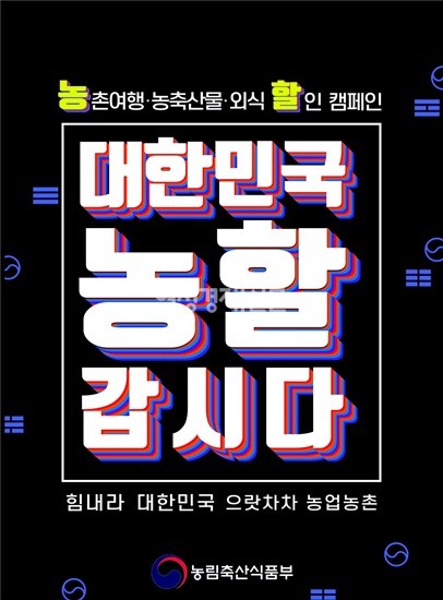 농림축산식품부는 총 748억 원의 예산으로 ▲농촌여행 ▲국산 농축산물 구매 ▲외식소비 등 3가지 분야의 할인 혜택을 주는 ‘대한민국, 농할갑시다’ 캠페인을 실시한다.