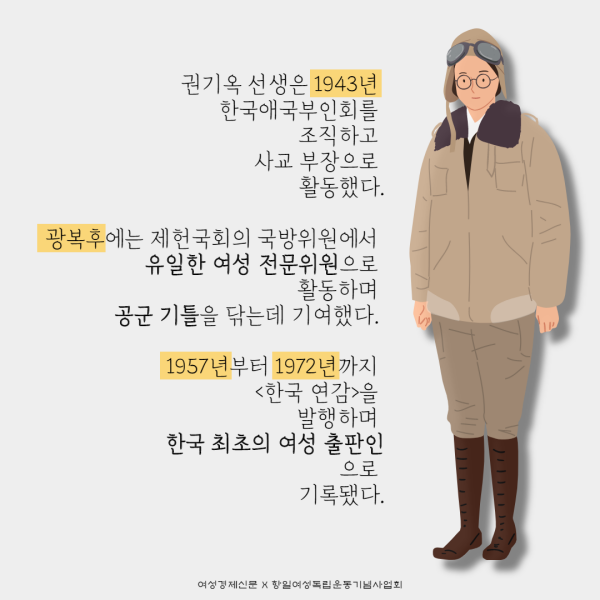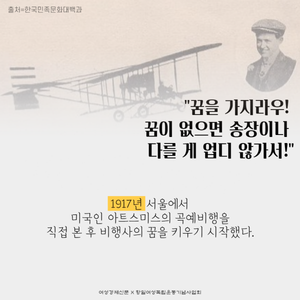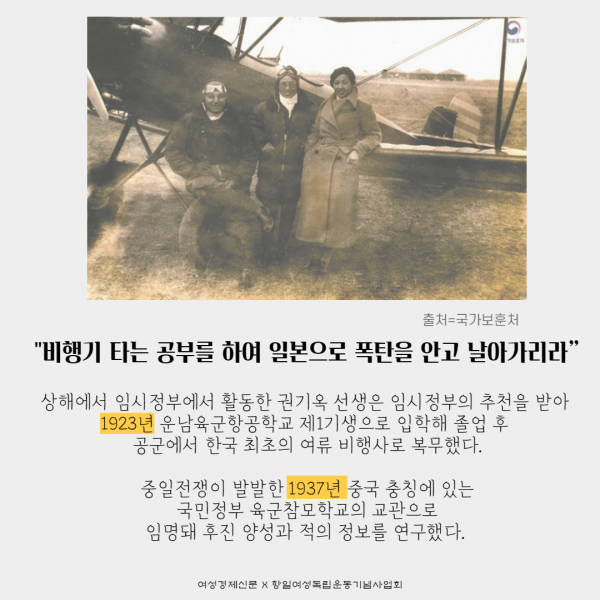우리가 또렷이 기억해야 할 네 번째 이름은 한국 최초 여성 비행사 권기옥 선생이다.