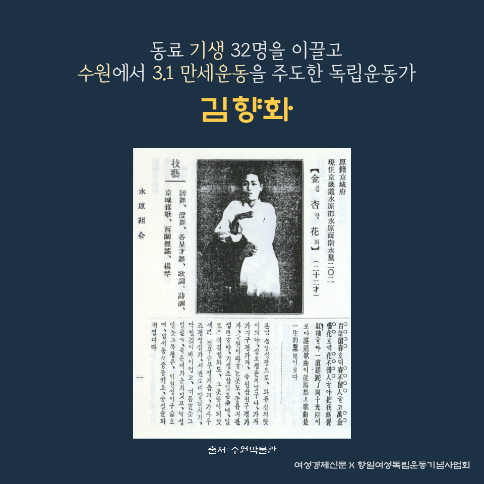 김향화 선생은 동료 기생 32명을 이끌고 수원에서 3.1 만세운동을 주도한 독립운동가다.