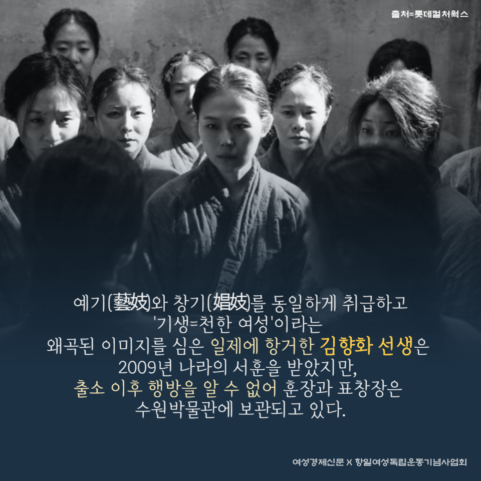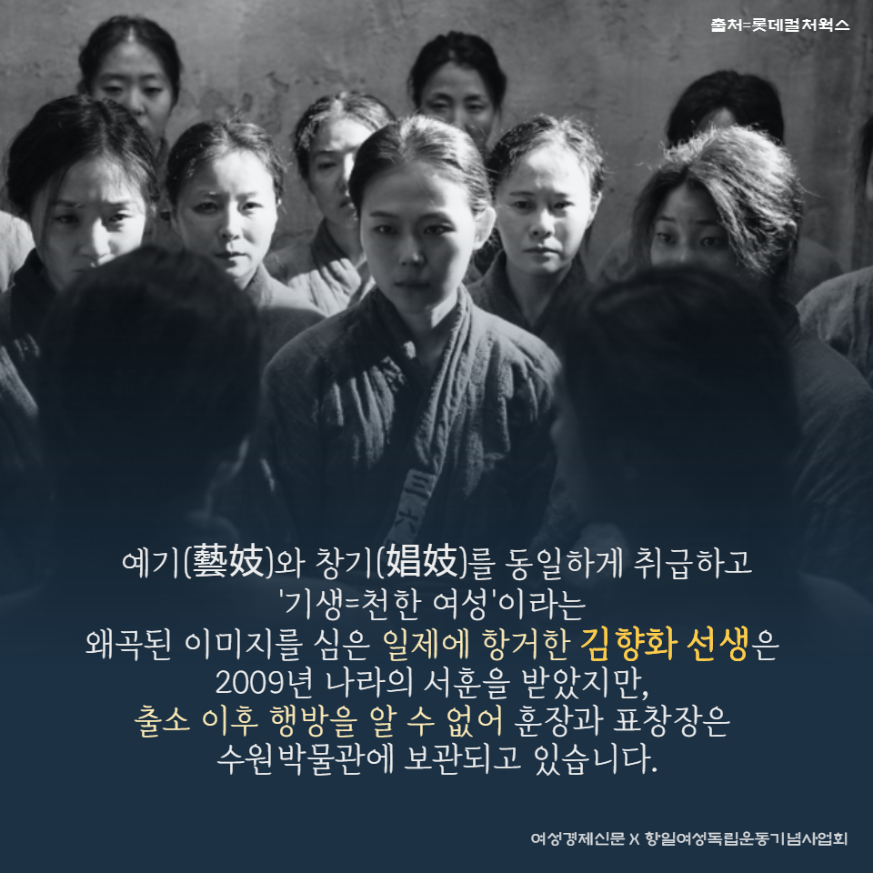 예기(藝妓)와 창기(娼妓)를 동일하게 취급하고 '기생=천한 여성'이라는 왜곡된 이미지를 심은 일제에 항거한 김향화 선생.
