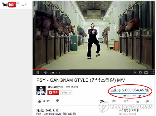 우리나라 가수 싸이의 뮤직비디오 '강남스타일'의 유튜브 조회 수가 시스템의 표시 한계를 초과해 구글이 시스템을 바꿨다고 발표했다.