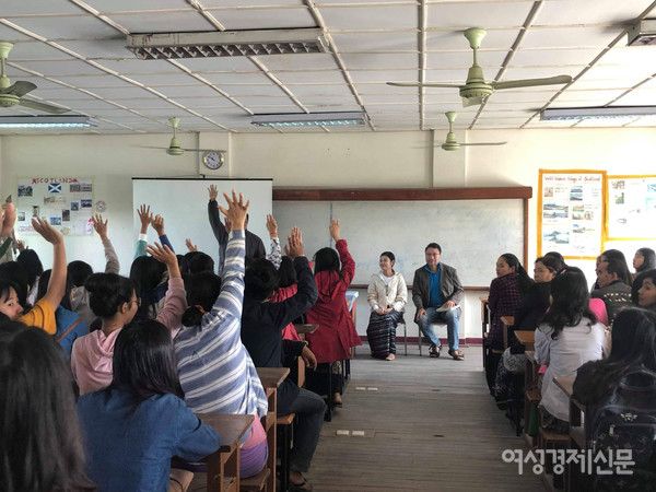 제가 사는 도시엔 스노우 퀸 사립 고등학교가 있습니다. 명문고로 한국어 과정이 있어 저희 선생님들이 가르치고 있습니다. 한류를 꿈꾸는 소녀들이지요. 이 학교 여교장선생님은 한국의 미술선생님이 오길 고대하는, 교육에 열정적인 분입니다. 한국어 과정 학생들은 한국이름을 갖고 싶어 합니다. 대학생들도 마찬가지입니다. 미얀마 사람들 이름은 길고 한국인이 발음하기가 굉장히 어렵습니다. 그래서 수업 첫날 대개 이름짓기를 합니다. 이 학교 학생들도 다 한국이름이 있습니다. 태희, 소영이, 윤희, 찬미, 지원이, 은형이, 희경이 등.