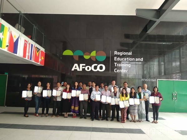 오늘은 양곤에서 40분쯤 걸리는 모비 마을로 갑니다. 이곳에 한국이 주도하는 아시아 최초의 국제협력기구 아포코(AFoCO) 교육센터가 있습니다. 유엔에 정식 등재된 아시아산림협력기구입니다. 국제기구 사무국은 서울 여의도에 있고, 미얀마에 회원국 인재들을 교육하고 훈련하는 센터가 있습니다. 회원국은 15개 나라. 산림에 깊은 관심을 갖고 서로 협력하는 나라들입니다. 한국, 싱가포르, 인도네시아, 말레이시아, 필리핀, 브루나이, 태국, 베트남, 라오스, 캄보디아, 미얀마. 그리고 나중 가입한 부탄, 몽골, 동티모르, 카자흐스탄까지. 센터에 들어서니 15개국 국기가 게양되어 있습니다.