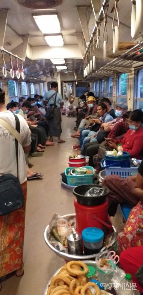 중앙역 플랫폼에서 기차표를 끊습니다. 100짯입니다. 한화 80원쯤 됩니다. 버스비의 절반입니다. 코로나 비상기간이라 외국인은 탈 수 없습니다. 마스크를 쓴 탓이라 그냥 모른 체 5시 기차에 오릅니다. 낡은 객차에는 잡상인들이 많이 있습니다. 역을 중심으로 일하는 노점상들도 퇴근하기 때문입니다. 미얀마 고유의 씹는담배 꽁야, 바나나 잎으로 싼 찰밥 펫톡, 과일로 만든 간식 등. 잡상인들이 이고지고 다니며 소란스럽게 팝니다. 벤치처럼 긴 좌석에는 이제 일을 끝내고 돌아가는 건설직 노동자, 학생, 직장인, 상인들이 비좁게 앉아서 갑니다. 객차 난간에는 젊은 연인들이 바깥 풍경을 내다보며 소근거립니다. 역마다 승객들이 수없이 타고 내리며 기차는 느릿느릿 양곤을 관통합니다.