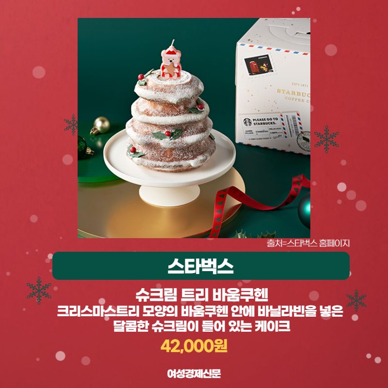 크리스마스트리 모양의 바움쿠헨 안에 바닐라빈을 넣은 달콤한 슈크림이 들어 있는 케이크
