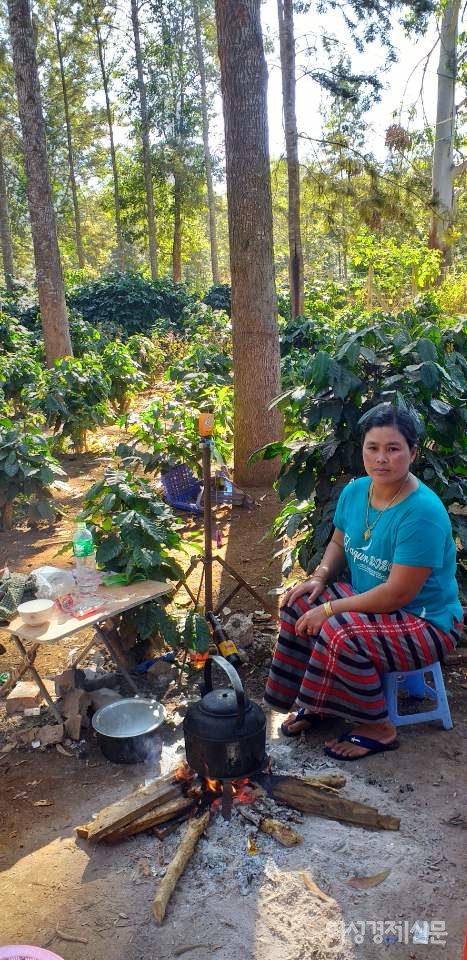오늘 아침은 삔우린 시내와 가까운 아웅바세이 커피농장으로 갑니다. 규모가 작은 농장이지만 농장 쉼터에서 모닝커피를 마실 수 있습니다. 재래식으로 로스팅도 합니다. 쉼터에는 장작불이 지펴 있고 주전자로 물을 끓입니다. 불을 쬐며 커피를 기다립니다. 이 도시는 커피의 계절이 가장 쌀쌀하고 춥습니다. 다른 계절은 선선해 휴양지로 알려져 있습니다. 커피가루를 여과없이 그냥 탄 미얀마 스타일의 커피잔. 천천히 가라앉길 기다립니다.