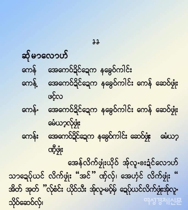 언어는 소통의 뿌리입니다. 혈통을 잇는 핏줄입니다. 이렇게 복잡한 언어사회, 각기 다른 문화와 풍습에도 불구하고 미얀마는 종족 간 잘 어울려 살고 있습니다. 긴 세월 동안 소수종족에 대한 박해도 있었지만. 연방, 평화, 관계 등을 중요시해야만 미래를 살아갈 수 있다는 것을 서로 알기 때문입니다. 그럼에도 이 나라 주민등록증에는 이름, 나이, 주소, 혈액형, 키, 인상착의 외에도 부친이름, 종족, 종교가 적혀 있습니다. 신분과 종교를 명시한 것입니다. 군부 통치시대에 만들어져 사회생활에 불이익을 당하기도 해 소수종족들은 싫어합니다. 새로운 시대, 새로 온 한해는 더 소통하고 더 배려하는 이 나라가 되길 소망합니다.