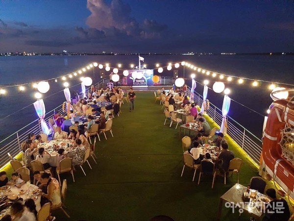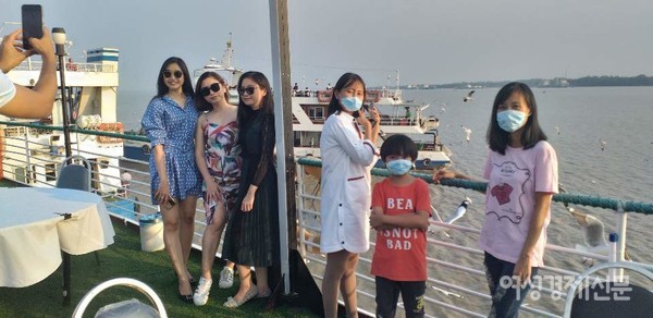 오후 5시 30분. 뷔페식 저녁식사가 시작됩니다. 닭고기와 야채, 볶음밥과 국수류가 준비되어 있습니다. 우리 일행들은 맥주도 한잔 주문합니다. 오랜만에 함께 하는 외식입니다. 선상에는 가족들, 연인들 약 1백여 명은 탄 것 같습니다. 사람들이 없을 줄 알았습니다.